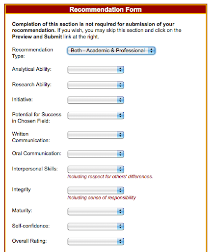 5-10개 정도 되는 항목을 평가 또는 questions에 대답을 마친 후, 추천인은 본인의 추천서를 첨부파일 형태로 첨부한 후, 제출을 완료하게 된다. 여기까지가 추천인이 추천서 링크를 받아서 추천서를 제출하는 일련의 프로세스이다.